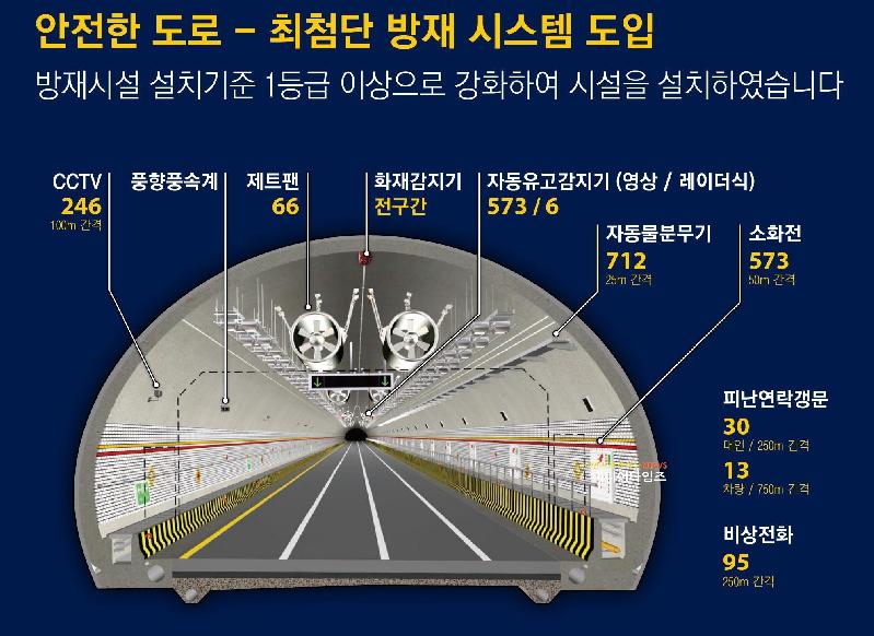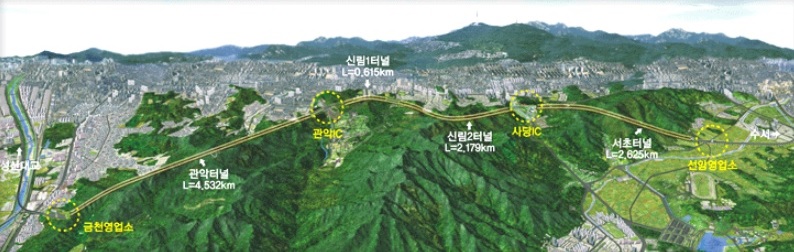 민자구간은 관악터널(4,990m), 봉천터널(3,230m),서초터널(2,653m)로 구성되어 있으며 3개 터널은 도심지에 건설되는 대규모 장대터널이다. 특히 이번에 개통하는 구간은 자동차전용도로로 지정돼 이륜자동차 통행이 제한되고 아울러 환경부와 환경영향평가 협의 결과에 따라 10톤 이상 화물차량의 통행도 제한된다.