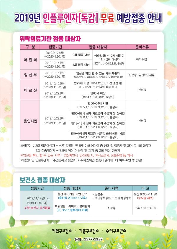 용인시는 감염에 취약한 시민들이 건강하게 겨울을 보내도록 내년 4월말까지 지정 병·의원에서 무료 독감 예방 접종을 한다고 19일 밝혔다.