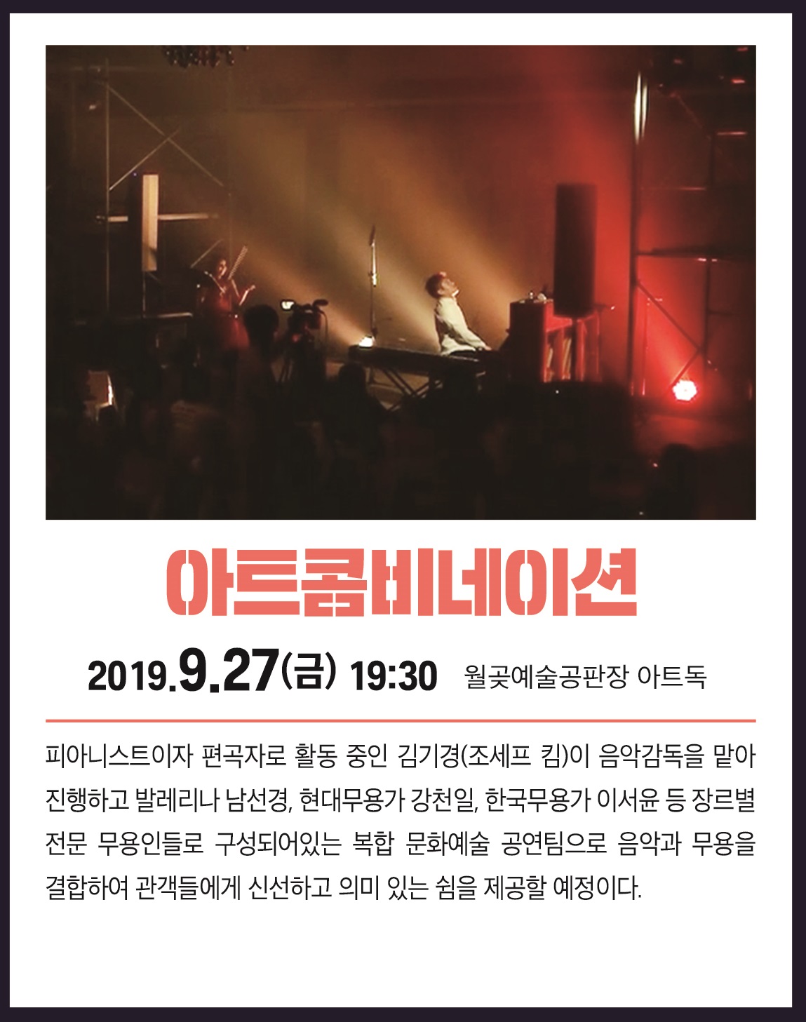 아트콤비네이션은 피아니스트이자 편곡자로 활동중인 김기경이 음악감독을 맡아 진행하고 발레리나 남선경, 현대무용가 강천일, 한국무용가 김채린 등 장르별 전문 무용인들로 구성되어 있는 복합 문화예술 공연팀으로, 음악과 무용을 결합해 관객들에게 신선하고 의미 있는 쉼을 제공할 예정이다.