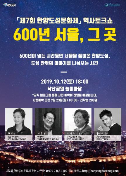 역사토크쇼 ‘600년 서울, 그곳’ 사전예약은 23일 오전 10시부터 한양도성문화제 블로그에서 가능하며 선착순 200명을 모집한다. 관람은 무료이고 사전예약을 하지 못했다면 현장에서 관람할 수 있다. 사전예약에 대한 궁금한 사항은 제7회 한양도성문화제 운영사무국로 문의하면 된다.