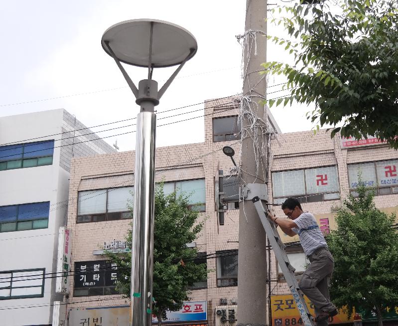 | 전신주의 지저분한 현수막 끈을 제거하고 있는 직원 |