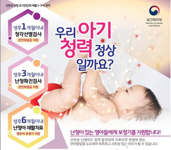 보청기 지원 대상은 기준 중위소득 180% 이하 가구 중 청각장애에 해당되지 않는 양측 귀에 난청을 가진 영유아이다.