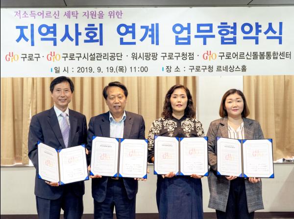 구로구가 지난 19일 구로구시설관리공단, 구로어르신돌봄통합센터, 워시팡팡 셀프빨래방 구로구청점과 ‘홀몸어르신 이불 빨래 서비스’ 협약을 체결했다.