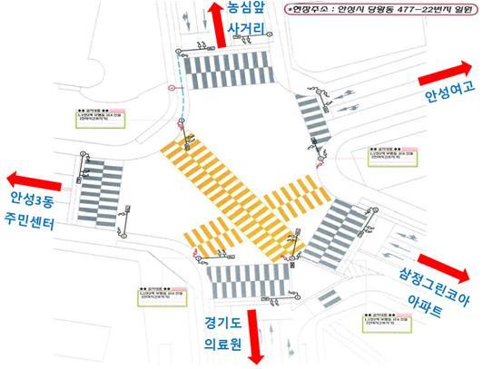 안성시는 안전한 보행환경 조성과 보행자의 이동편의 증진을 위해 안성시 당왕동 477-22번지 일원 안성여고 앞 교차로에 대각선 횡단보도를 설치하여 오는 23일부터 운영한다고 밝혔다.