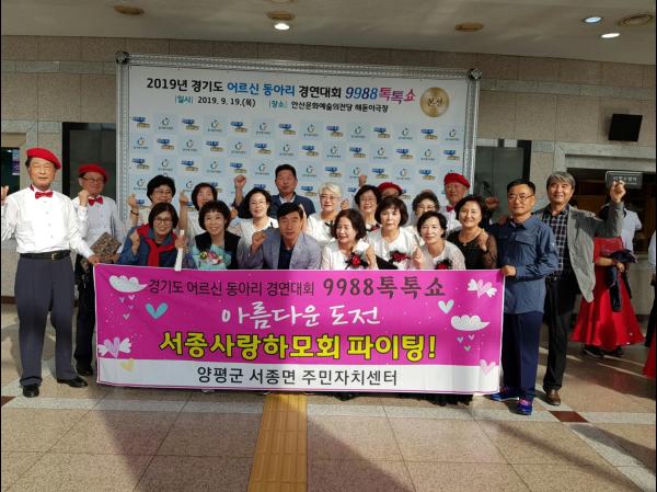 지난 19일 안산문화예술의전당에서 열린 ‘2019 어르신 동아리 경연대회 9988 톡톡쇼’에서 서종면 주민자치센터 하모니카반 ‘서종사랑하모회’가 인기상을 수상했다.