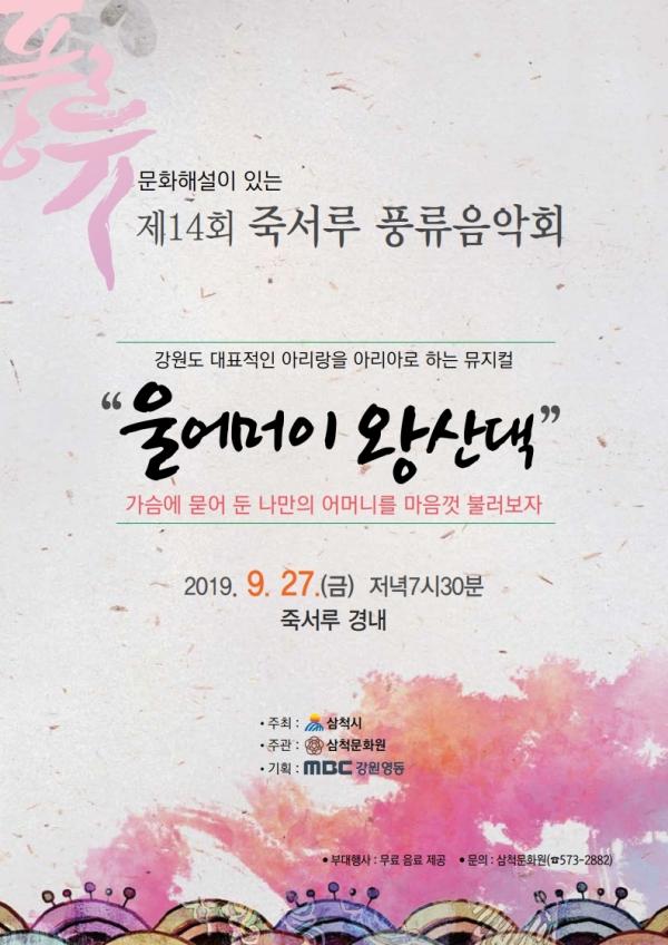 삼척시는 우리 시를 찾는 외지 관광객 및 시민들에게 죽서루와 문화예술의 도시인 삼척을 알리고, 추억거리와 힐링을 제공하고자 오는 27일 오후 7시 30분‘제14회 죽서루 풍류음악회’를 개최한다.