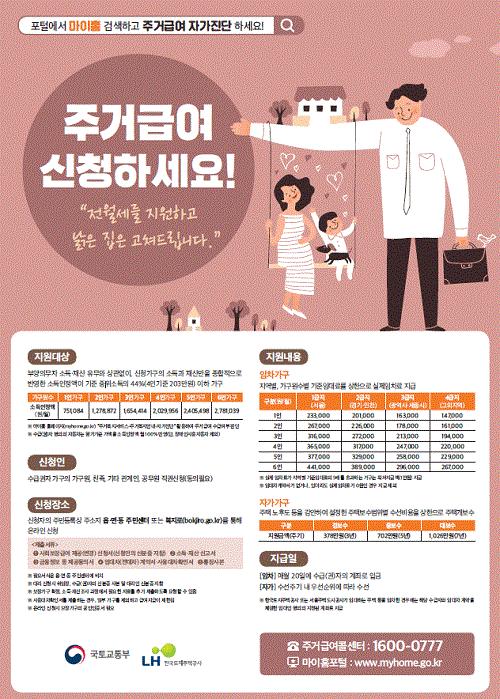 연중 상시 주소지 관할 읍·면·동 행정복지센터에서 신청 가능하며, 선정되면 임차가구는 소득 인정액에 따라 매월 최대 220천원을 지원받을 수 있고, 자가 가구는 주택 노후도에 따라 개보수를 받을 수 있다.
