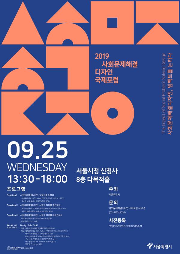 국내·외 사회문제를 해결하고 지속가능한 사회를 만들기 위해 활발하게 활동하는 전문가들이 한 자리에 모이는 ‘2019 사회문제해결디자인 국제포럼’이 오는 25일, ‘사회문제해결디자인, 임팩트를 논하다’라는 주제로 서울시청에서 열린다.