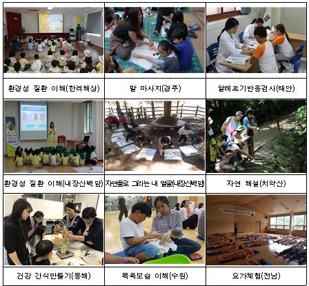 참가자들은 자연재료 식사 및 간식, 천연보습제 등을 만들어 보고 동·식물 관찰 숲길 걷기와 같은 친환경 체험을 할 수 있다. 또한 전문 의료인에게 질환에 대한 진단과 상담, 교육 등을 받을 수 있다.