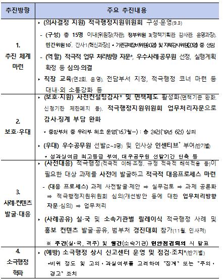 이밖에 소극행정 상시 신고센터를 설치·운영하고 반기별로 소극행정을 특별 점검하여 적발된 사례에 대하여는 엄정하게 조치한다.