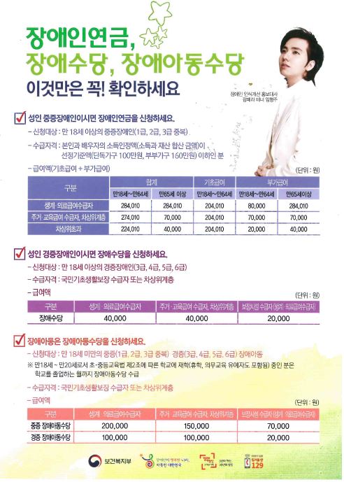 장애수당은 경증장애인들에게 지급되는 급여로 신청대상은 만18세 이상의 경증장애인(3급, 4급, 5급, 6급)이며 수급자격은 국민기초생활보장 수급자 또는 차상위계층이다