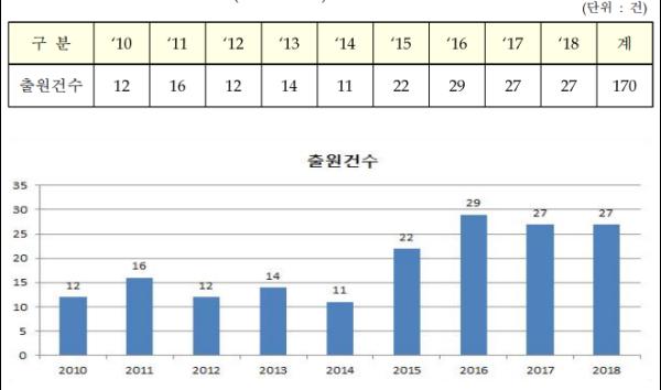 이를 출원인별로 보면, 내국인이 142건, 외국인이 28건으로 내국인이 특허출원을 주도하고, 외국인 중에는 일본이 14건, 미국이 6건으로 그 뒤를 따랐다.