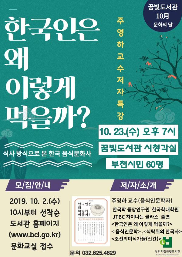 부천시립꿈빛도서관은 10월 문화의 달을 맞이해 오는 10월 23일 오후 7시부터 2시간 동안 ‘한국인은 왜 이렇게 먹을까?’의 저자 주영하 교수를 초빙해 특강을 개최한다.