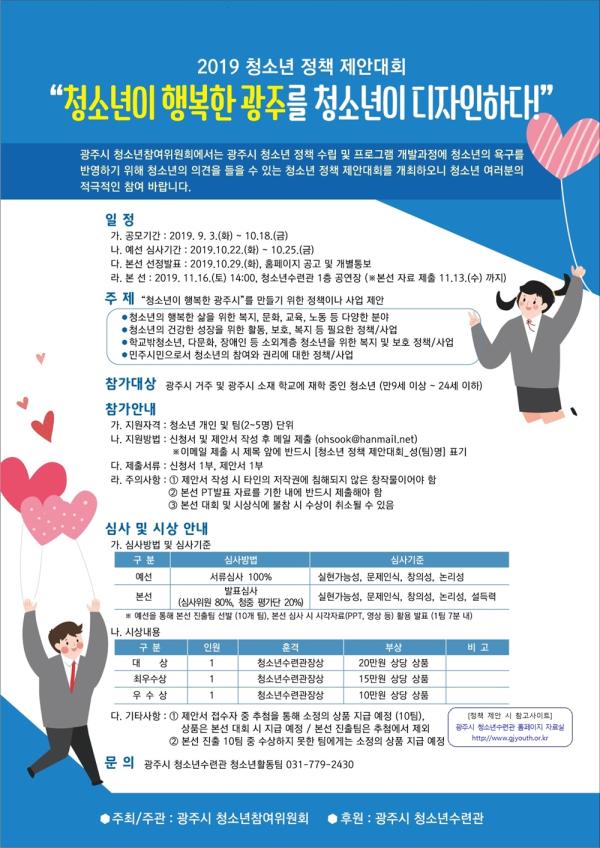 참가대상은 광주시 관내 학교에 재학 중이거나 거주하는 청소년이며 청소년 입장에서 ‘청소년이 행복한 광주시’를 만들기 위한 정책이나 사업을 오는 10월 18일까지 자유롭게 제안하면 된다.