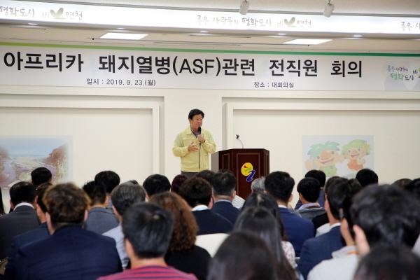 연천군은 23일 군청 대회의실에서 아프리카 돼지열병 근무자 등을 제외한 전 직원이 참석한 가운데 ‘아프리카 돼지열병’ 확산 저지를 위한 전 직원회의를 가졌다.
