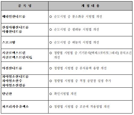 아울러 아질산나트륨, 차아염소산나트륨 등 식품첨가물 12개 품목에 대한 성분규격 시험법을 개선하는 내용이 포함됐다.