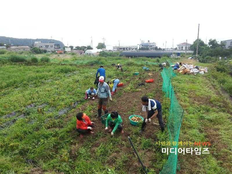 | 21일, 특화사업의 일환으로 심은 사랑의 감자를 수확하고 있는 주민자치위원들 모습 |