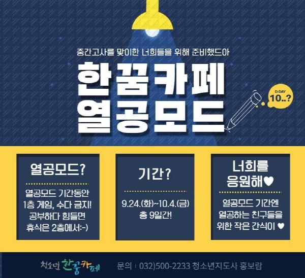부평구 청소년수련관 청소년한꿈카페는 중간고사 기간을 맞아 오는 24일부터 10월 4일까지 약 2주간 스터디카페 체재로 운영한다.