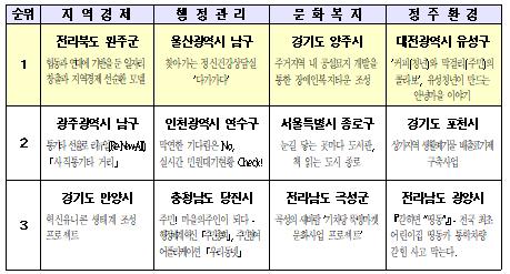 지난 6월 전국 226개 시군구 가운데 175개 자치단체가 자율 응모했으며 한국생산성본부가 취업자 증가율, 문화기반시설 이용 수준, 지역안전지수, 주민참여예산 수준, 출산을 증가율 등 20개 지표를 통해 생산성 지수를 측정했다.