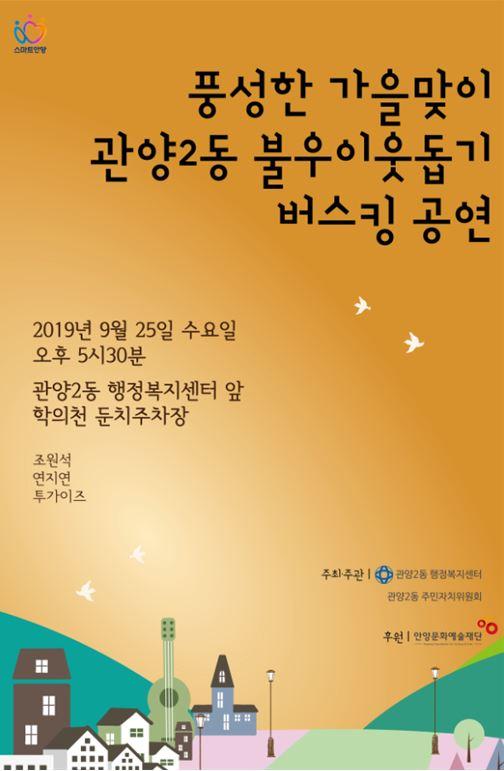 어려운 이웃을 돕기 위한 사랑의 버스킹 공연이 오는 25일 안양시 관양2동 행정복지센터 앞 학의천변에서 열린다.