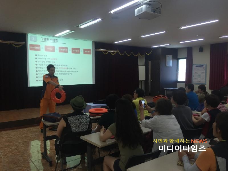 | 거제소방서 별관 대회의실에서 119시민수상구조대원에 대한 사전 안전교육을 실시하고 있는 모습 |