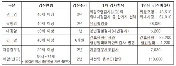 올해부터 추가되는 폐암검진은 만54세~74세 남녀 중 30갑년 이상의 흡연력을 보유한 자에 대해 2년 주기로 실시한다.
