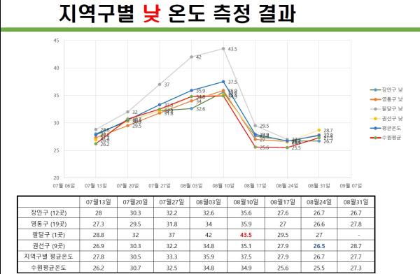 지난여름, 수원에서는 어디가 가장 더웠을까? 지난여름 수원시 곳곳의 온도를 기록한 ‘2019 수원시 열지도’가 완성됐다.