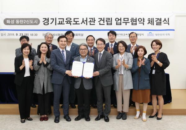 경기도교육청 교육감 이재정와 화성시장 서철모, 국회의원 이원욱은 지난 23일 화성시청 동탄출장소에서 ‘화성지역 경기교육도서관 건립을 위한 MOU’를 체결했다.