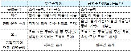 지자체는 ‘주차장법’에 따라 청사, 공원·체육시설·도매시장 등의 시설에 부설한 주차장과 도로 노면 등의 장소에 설치하는 노상·노외주차장, 즉 공영주차장을 운영하고 있다.