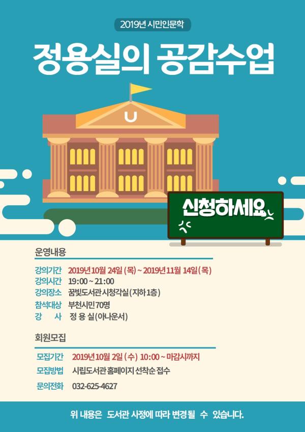 부천시립꿈빛도서관은 오는 10월 24일부터 11월 14일까지 매주 목요일 저녁 7시부터 2시간동안 2019 꿈빛도서관 시민인문학 마지막 강좌인 ‘정용실의 공감수업’을 운영한다.