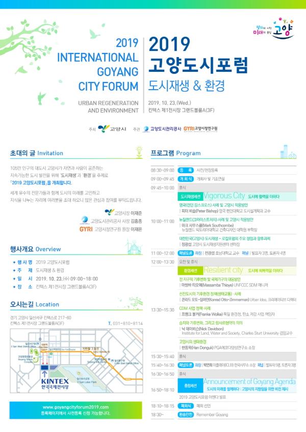 고양시는 국내외 도시재생 및 환경 전문가들이 한자리에 모이는 ‘2019 고양도시포럼’을 오는 10월 22일부터 23일까지 고양시 일원 및 킨텍스에서 개최 한다.