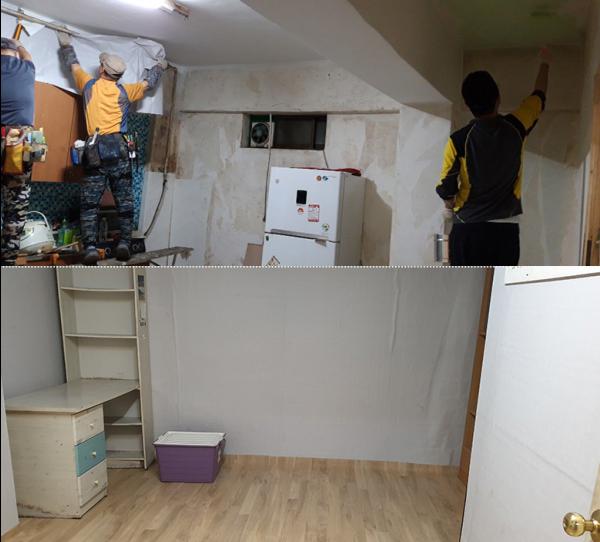 대상자는 백석1동 다세대 연립주택 지하에서 10년간 거주 중인 한부모 4인 가구 사례관리 대상자로, 주거 내부는 곰팡이균 증식으로 도배 및 장판 등이 오염되어 위생이 취약하고 일상생활 유지가 매우 힘든 상태였다.
