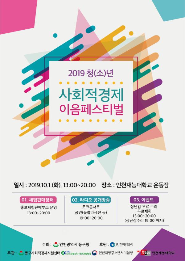 인천 동구는 ‘2019 청년 사회적경제 이음페스티벌’을 오는 10월 1일 오후 1시, 인천재능대학교 운동장에서 개최한다고 24일 밝혔다.