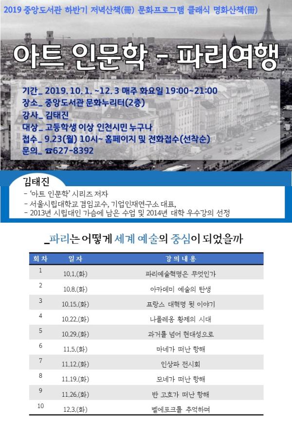인천광역시중앙도서관에서는 하반기 저녁산책 문화프그램 ‘클래식 명화산책’을 오는 10월 1일부터 12월 3일까지 매주 화요일 저녁7시, 중앙도서관 문화누리터에서 운영한다.