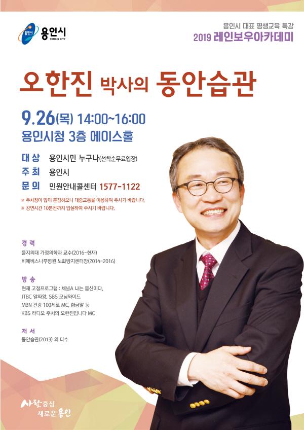 용인시는 오는 26일 시청 에이스 홀에서 시민을 위한 명사 초청 무료강좌인 ‘레인보우 아카데미’의 9월 행사로 오한진 가정의학 전문의의 특강을 연다.