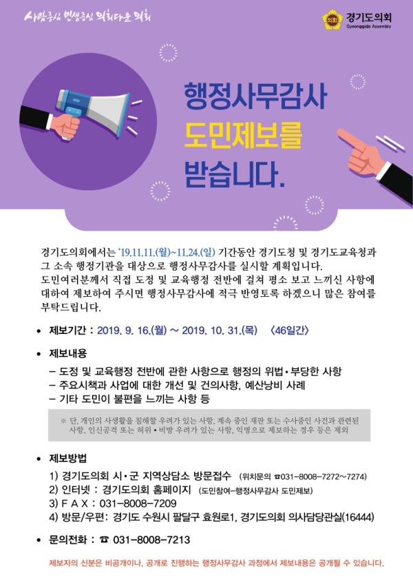 경기도의회는 도민의 참여와 소통을 통해 내실 있는 행정사무감사를 위해 지난 16일부터 오는 10월 31일까지 도민제보 창구를 운영한다.