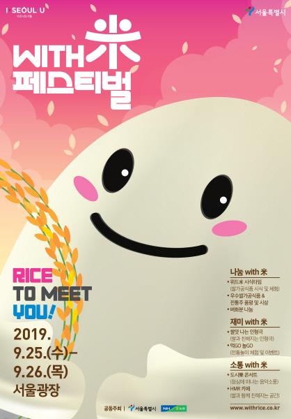 서울시는 우리쌀 가공식품과 전통주를 테마로 한 ‘위드미 페스티벌’을 오는 25일과 26일 2일간 서울광장에서 진행한다고 밝혔다. 120여개 기업·농업인이 참여하는 이번 행사는, 상품력은 우수하나 판매망이 취약한 중소 우리쌀 가공식품 생산기업을 알리고, 우수한 제품을 시민들에게 소개하기 위한 자리로 서울시와 농협이 공동으로 주최한다.