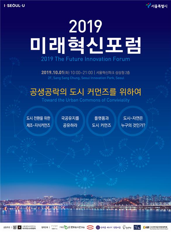 서울시는 오는 10월 1일 서울혁신파크에서 ‘공생공락의 도시 커먼즈를 위하여’를 주제로 ‘2019 미래혁신포럼’을 개최한다고 밝혔다. 이번 포럼에서는 국내외 공유경제, 도시 커먼즈 운동 및 지역 활동가, 사회혁신 전문가, 청년 연구자 등 400여 명이 모여 서울시 ‘공유도시’ 정책, 불평등을 넘어선 지속가능한 도시로의 전환 방향을 모색한다.