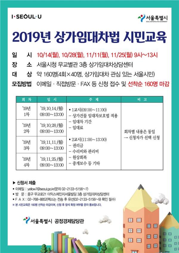‘상가임대차법 시민교육’은 10월 14일, 10월 28일, 11월 11일, 11월25일 9시~오후 1시까지 4시간동안 서울시청 무교별관에 위치한 서울시 상가임대차상담센터에서 진행된다. 교육비는 무료다.