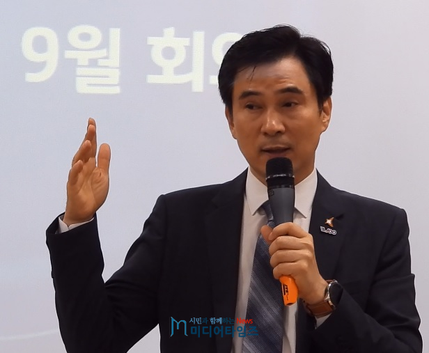 | 서철모 시장이 24일 저녁 남양읍 행복복지센터에서 열린 9월‘서부2권역 화성시민 지역회의'에서 지난 8월 제안된 안건에 대해 입장을 밝히고 있다.ⓒ미디어타임즈 |