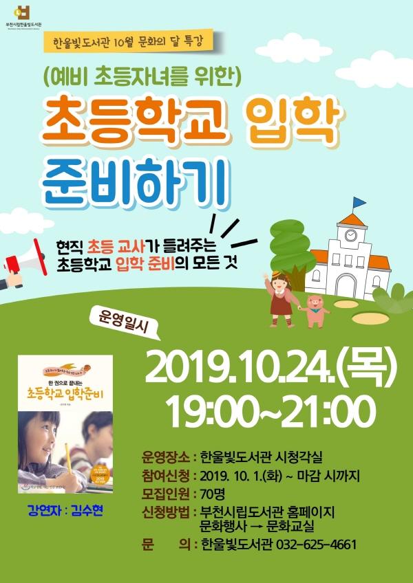 부천시 한울빛도서관은 10월 문화의 달을 맞이하여 오는 10월 24일 저녁 7시부터 2시간 동안 ‘예비 초등자녀를 위한 초등학교 입학준비’를 주제로 부모교육특강을 개최한다.