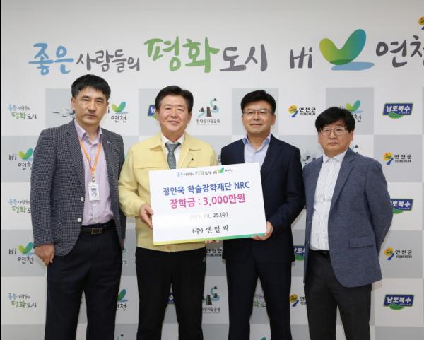 정인욱 학술장학재단과 연천군 소재 ㈜NRC가 어려운 환경에서도 학업에 정진하는 연천군 고등학생 및 대학생을 위해 25일 연천군을 방문해 장학금 3천만원을 전달했다.