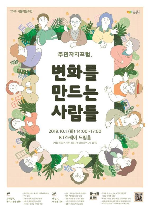 서울시 마을공동체 종합지원센터는 오는 10월 1일 화요일 오후2시부터 5시까지 광화문 ‘KT스퀘어 드림홀’에서 ‘주민자치포럼, 변화를 만드는 사람들’을 개최한다.