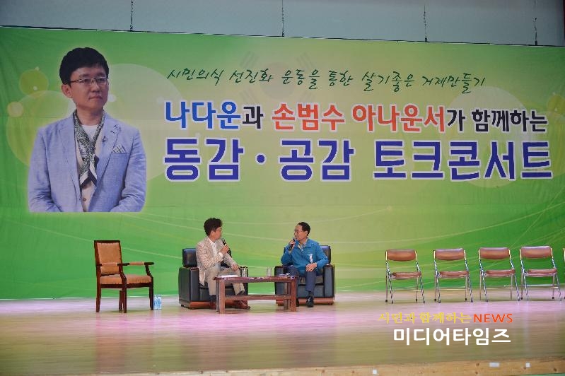 [미디어타임즈 = 최귀복 기자] 거제시 나부터 다함께 시민운동본부(본부장 박행용)에서는 지난 27일 오후 2시부터 거제시 청소년 수련관 대강당에서 기초질서, 친절 ‧ 예절, 희망 ‧ 나눔 등 3대 중점과제 추진을 통한 시민의식 변화를 도모하는 ‘동감 ‧ 공감 토크콘서트’를 개최했다.