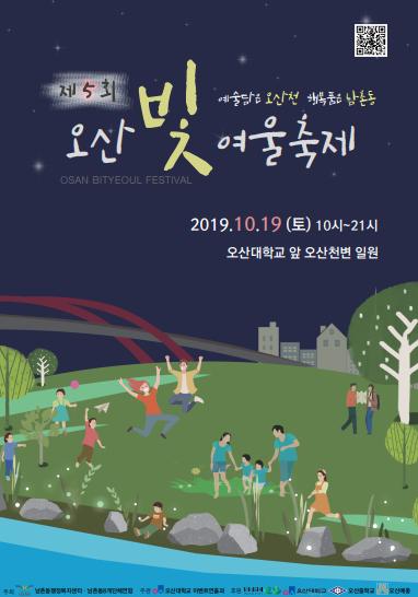 오산시 남촌동과 오산대학교 이벤트연출과는 오는 10월 19일 오전 10시부터 오후 9시까지)에 오산대학교 앞 오산천 특설무대 및 남촌소공원에서 ‘예술담은 오산천, 행복품은 남촌동’이라는 주제로 제5회 오산 빛여울 축제를 개최한다.