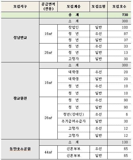 성남판교 경기행복주택은 전용면적 16㎡형 ‘창업인’ 100호와 ‘청년’ 124호, 26㎡형 ‘청년’ 46호와 ‘고령자’ 30호 등 총 300호를 모집하며, 보증금 3,876만원~6,992만원에 월 임대료 14만5천원~26만2천원이다.