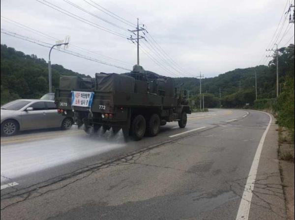 지난 19일부터 6군단, 8사단의 지원을 받아 총 5대의 제독차량을 운영, 광적면과 남면, 은현면 등 주요 연접도로 5개소 15KM구간을 집중 소독하고 있으며 25일부터는 추가로 72사단에서 2대의 제독차량을 투입해 장흥면 주요 도로 2개소 6KM 구간에 대한 작업을 벌이고 있다.