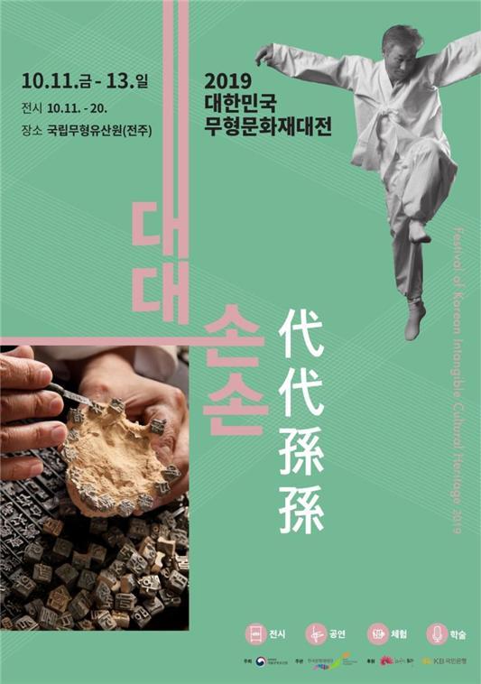 문화재청 국립무형유산원이 주최하는 무형문화재 종합 축제 ‘2019 대한민국 무형문화재대전’이 오는 10월 11일부터 13일까지 한국문화재재단의 진행으로 국립무형유산원에서 개최된다.