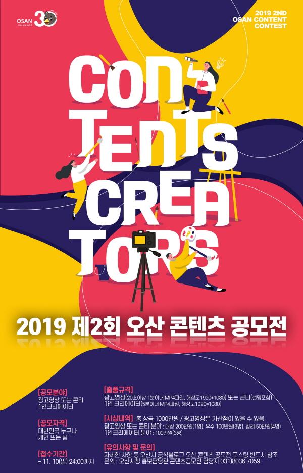 오산시는 시 승격 30주년 기념해 오는 11월 10일까지 2019 제2회 오산 콘텐츠 공모전을 개최한다.