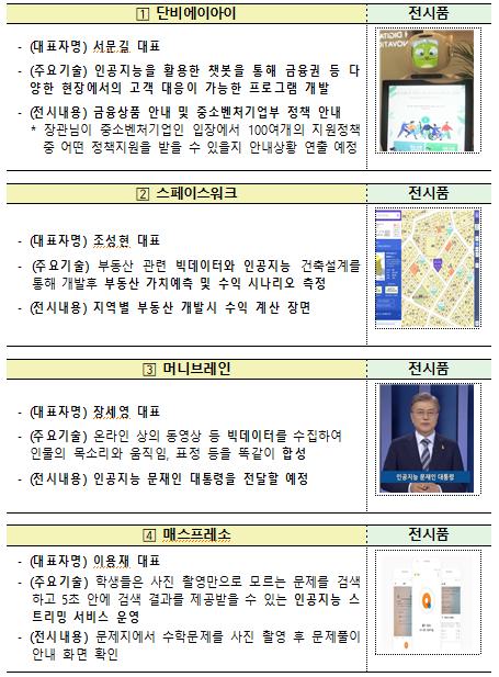 또한, 스페이스워크, 단비에이아이, 머니브레인, 매스프레소 등 AI 창업기업 8개사가 제품을 전시해 기술력을 뽐냈으며, 투자 유치를 위한 상담, 정부의 지원 프로그램 상담부스도 운영됐다.